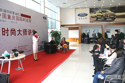 11月13日下午14点,2014长安福特新蒙迪欧中国重庆国际时装周艺术总监,著名服装设计师张义超与中国著名彩妆造型大师毛戈平来到了位于重庆市新牌坊的长安福特安福汽车4S店,参加了一个呗命名为“时尚大师讲堂”的活动,近百位新蒙迪欧车主来到现场(绝大部分为女性)与长安福特公司员工一起“零距离接触”了这两位时尚界的名人,聆听他们对于穿衣和化妆方面的意见与建议,并可以自由地提出问题……,这一活动受到了车主的欢迎,现场人越来越多,气氛越来越热烈!可以说,这一活动有效地延伸了时装周的外延,将时尚与汽车汇聚的魅力展现的淋漓尽致。