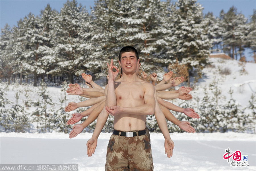 2015年2月26日,黑龙江黑河,黑龙江省军区某边防团机动步兵连官兵冒着零下10余度严寒气温进行赤膊浴雪耐寒训练,士气如虹,血性十足。魏建顺/东方IC
