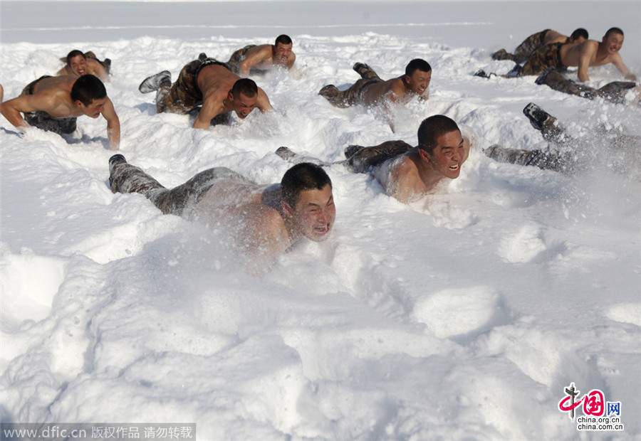 2015年2月26日,黑龙江黑河,黑龙江省军区某边防团机动步兵连官兵冒着零下10余度严寒气温进行赤膊浴雪耐寒训练,士气如虹,血性十足。