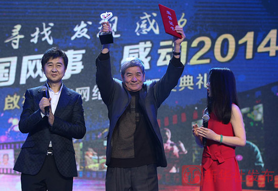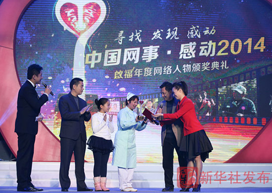 1月16日,歌手付笛声(左二)、任静(右一)为“中国网事·感动2014”年度人物“深情丈夫”王世所颁奖。新华社发布客户端记者 金立旺 摄