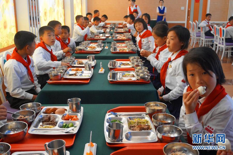 5月16日,在朝鲜元山的松涛园国际少年团夏令营,参加夏令营的孩子在食堂吃午饭。松涛园国际少年团夏令营位于朝鲜江原道元山市西北。5月2日刚刚结束修整的夏令营于10日迎来了从各地选拔的优秀中学生、军官子女、孤儿和小足球运动员。松涛园国际少年团夏令营1959年由朝鲜已故最高领导人金日成指定位置建成。新华网记者 杜白羽 摄