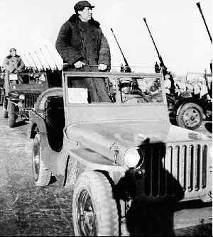 1945年初,随着中美联军打通中印公路和滇缅公路,美国的援华物资开始源源不断地进入中国。延安的八路军也得到了不少军用物资,包括少量的美制卡车和维利斯军用吉普车。中央办公厅便给在延安的党政军领导人配备了吉普车。毛泽东分到的是一辆由美国福特公司1944年生产的4缸吉普,2.2升,功率为36.8千瓦,3挡变速器,最高时速102公里,4座,整车重约1吨。身材高大的毛泽东上下这辆福特吉普车颇有些不便,以至于有一次他对办公厅的同志开玩笑说,是不是能替他换一辆十轮大卡车?毛泽东就是坐着这辆吉普车到简易的延安机场,第一次坐美军顾问团的道格拉斯DC-3军用飞机赴重庆,与蒋介石商讨国共合作大计,也是乘坐这辆美制吉普车,从河北的西柏坡移驻北平。在进入北平前,毛泽东和朱德等还乘坐吉普车在西苑机场检阅了参加平津战役的解放军坦克部队,并留下了一张流传甚广的新闻照片。